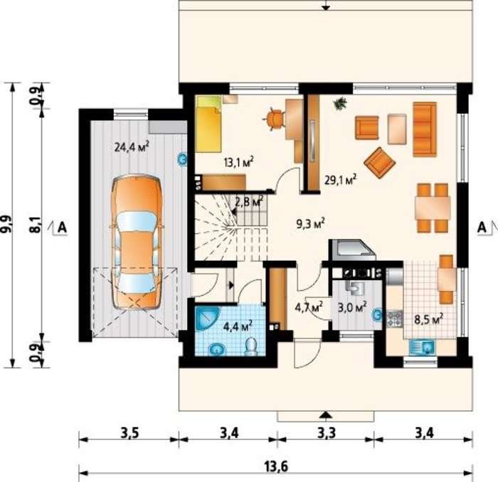Первый этаж вмещает комнаты разного назначения. Просторный гараж рассчитан на хранение и обслуживание одной единицы транспорта. Площади достаточно как для размещения инструмента, так и выполнения ремонтных работ. Отдельная спальня может быть выделена под личное помещение для члена семьи с ограниченными возможности или оставлена как запасная, для оставшегося ночевать родственниками, гостья.