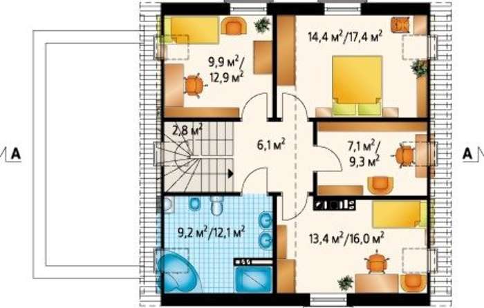 Второй этаж представлен 4 жилыми помещениями, три из которых отведены под спальни. Небольшая комната может быть меблирована под детскую или кабинет.