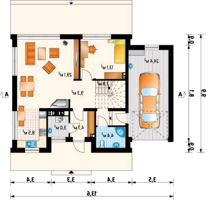 Первый этаж вмещает комнаты разного назначения. Просторный гараж рассчитан на хранение и обслуживание одной единицы транспорта. Площади достаточно как для размещения инструмента, так и выполнения ремонтных работ. Отдельная спальня может быть выделена под личное помещение для члена семьи с ограниченными возможности или оставлена как запасная, для оставшегося ночевать родственниками, гостья.