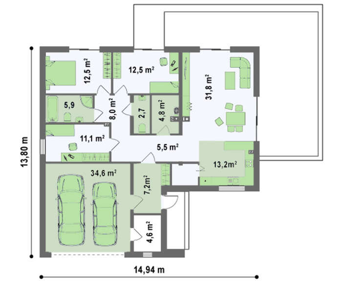4M182загородный дом, который удовлетворит все желания и потребности, утомленных большим городом людей. В нем сочетаются простота деревенского дома и комфорт городских апартаментов. Большой гараж на две машины позволяет нагрянуть на уикенд большой компанией. В одноэтажном доме компактно поместилось все, что надо для отдыха в выходные, или более длительного проживания в любую погоду и время года. На просторной кухне будет приятно не только готовить еду для семейных завтраков и ужинов, но и заняться заготовками на зиму. Столовая и гостиная располагают к хорошему настроению и дружеской беседе в кругу семьи и близких друзей.