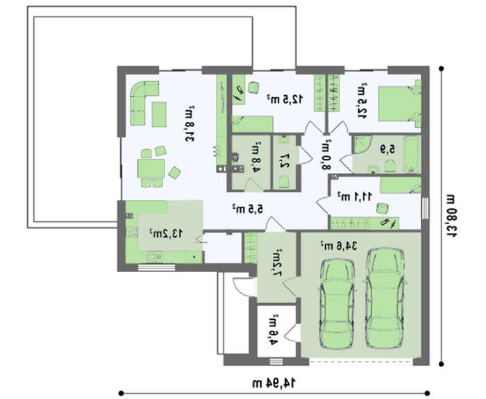 4M182загородный дом, который удовлетворит все желания и потребности, утомленных большим городом людей. В нем сочетаются простота деревенского дома и комфорт городских апартаментов. Большой гараж на две машины позволяет нагрянуть на уикенд большой компанией. В одноэтажном доме компактно поместилось все, что надо для отдыха в выходные, или более длительного проживания в любую погоду и время года. На просторной кухне будет приятно не только готовить еду для семейных завтраков и ужинов, но и заняться заготовками на зиму. Столовая и гостиная располагают к хорошему настроению и дружеской беседе в кругу семьи и близких друзей.