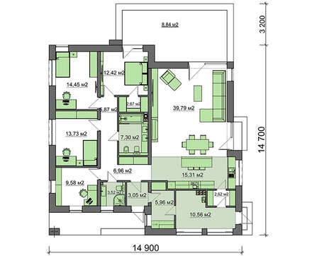 Проект содержит три раздела – Архитектурный, Конструктивный и Инженерный: водоснабжение, отопление, вентиляция, канализация, электроснабжение (приобретается за дополнительную плату) + Пояснительная записка.