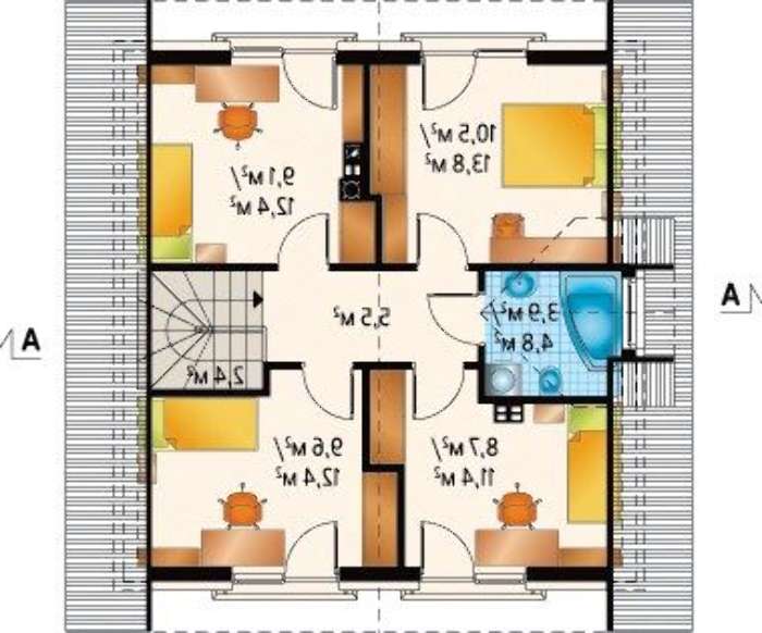 Второй этаж представлен четырьмя просторными личными апартаментами, практически одинаковой планировки и площади. Каждая спальня имеет индивидуальный французский балкончик, несмотря на минимальные размеры ажурных элементов, они позволяют много времени проводить на свежем воздухе. В планировке предусмотрены две санитарные комнаты, которые позволят с комфортом принимать водные процедуры и справлять естественные нужды.