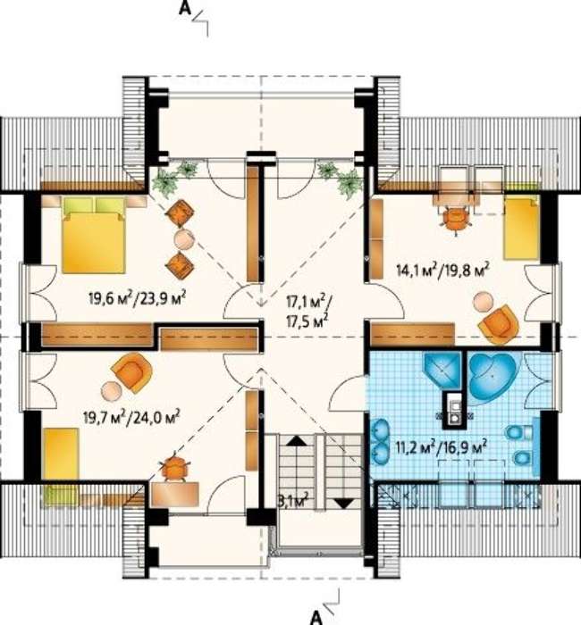 Гостевая зона выделена в отдельное помещение и имеет свой выход на внутренних простор, что помогает большую часть времени жильцами их друзьям проводить на живописном участке в окружении красивых цветов. Индивидуальных помещений предусмотрено четыре. Размещенное на первом этаже оборудовано своим санитарным узлом, по решению хозяина может быть детской, спальней старшего поколения или бизнес-кабинетом.