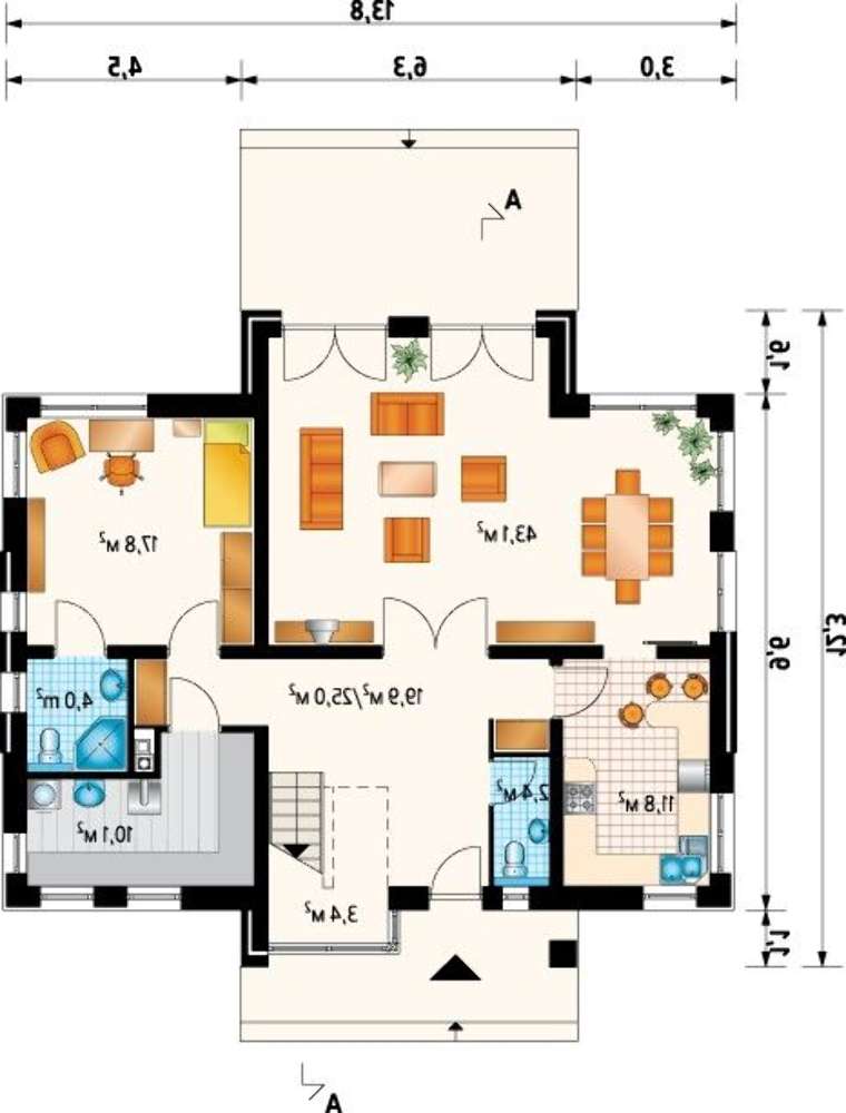 Большая часть пространства первого этажа определена под зону совместного времяпрепровождения. Особо продуманно расположение кухни. Ее отгороженное размещение поможет хозяйке священнодействовать над приготовлением снеди в спокойных условиях и ограничит движение запахов по пространству дома. К особенностям планировки относится просторный холл, размеры которого позволяют с комфортом встречать гостей и размещать обширный гардероб.