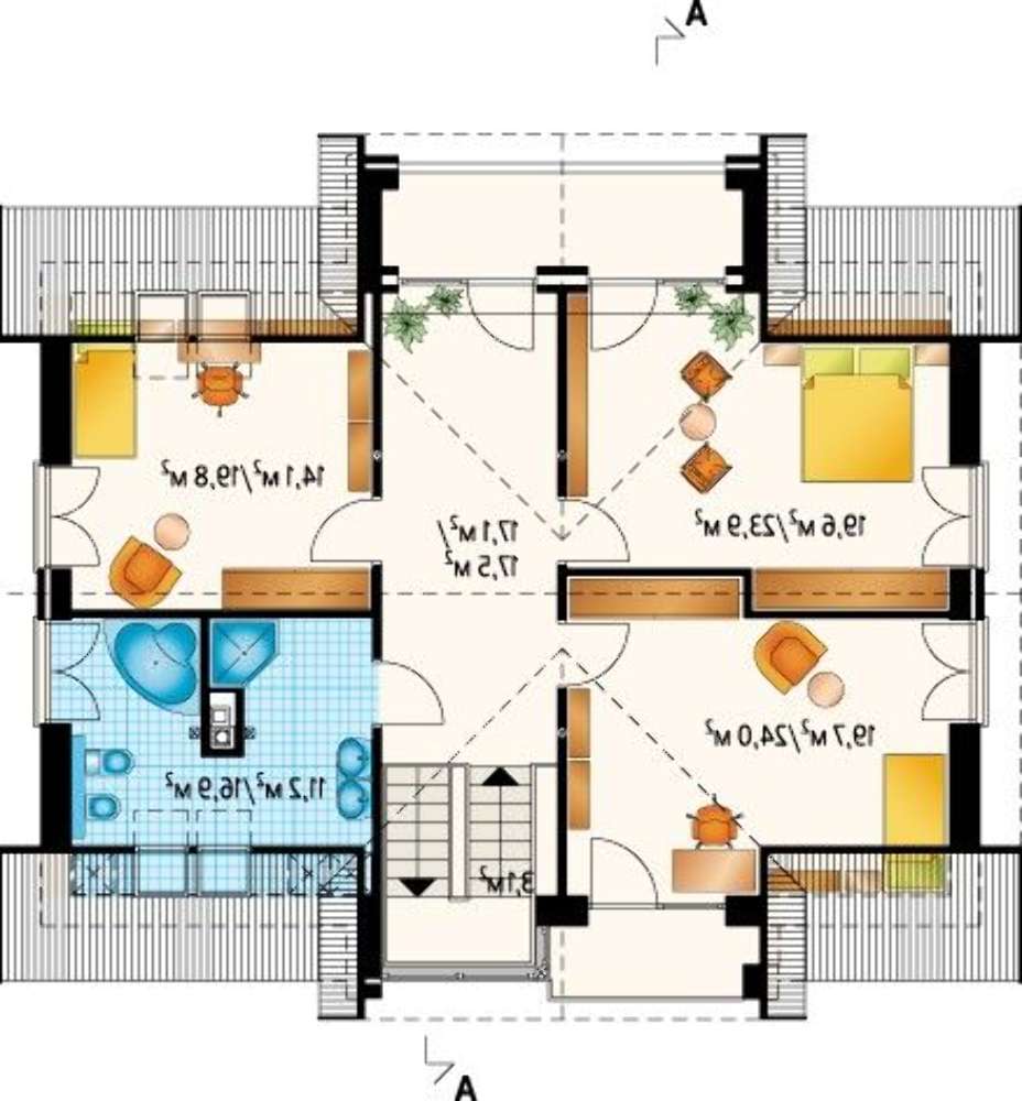 Гостевая зона выделена в отдельное помещение и имеет свой выход на внутренних простор, что помогает большую часть времени жильцами их друзьям проводить на живописном участке в окружении красивых цветов. Индивидуальных помещений предусмотрено четыре. Размещенное на первом этаже оборудовано своим санитарным узлом, по решению хозяина может быть детской, спальней старшего поколения или бизнес-кабинетом.