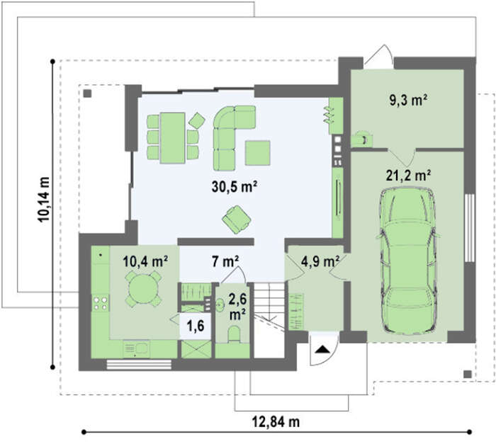 Проект современного стильного небольшого дома с мансардой, гаражом для 1 автомобиля