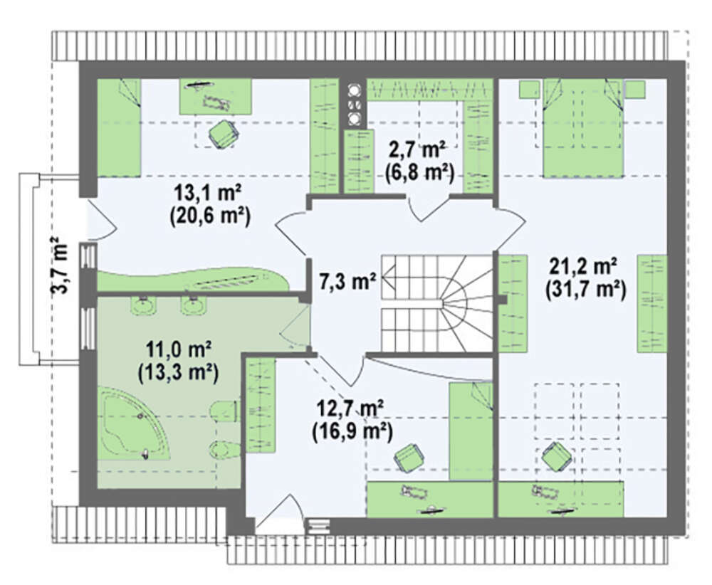 Вся приватная жизнь семьи сосредоточена на втором этаже. Три спальни, просторная гардеробная и большая ванная образуют комфортную ночную зону. Балкон во фронтоне и большое окно дополняют ощущение уюта в мансарде.