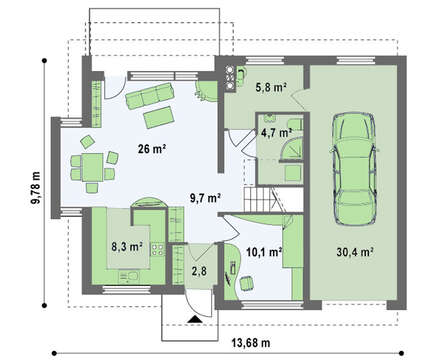 На первом этаже расположена дневная зона. Ее образуют  гостиная с угловым камином, столовая и кухня. Несомненно, это уютное пространство станет центром семейной жизни. Еще одну функциональную подзону первого этажа образуют дополнительная спальня, отдельный санузел, совмещенный с прачечной и котельная. Через котельную можно попасть в большой гараж. Кстати, его размеры вполне позволяют организовать здесь мастерскую или еще одну кладовку.