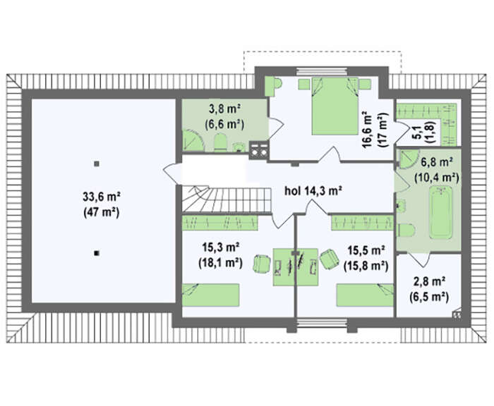 Итак, пункт первый – каждому отдельную комнату. Без проблем, добро пожаловать  в мансарду. Плюс ванная и дополнительная комната, в которой можно устроить прачечную. К тому же, в самой большой комнате предусмотрена отдельная гардеробная и собственная ванная комната. А как дополнительный бонус – чердачное помещение над гаражом. И здесь уже все зависит от вашей фантазии: будет ли это зона отдыха с домашним кинотеатром, собственный тренажерный зал или дополнительная жилая комната. Нужное – подчеркнуть.
