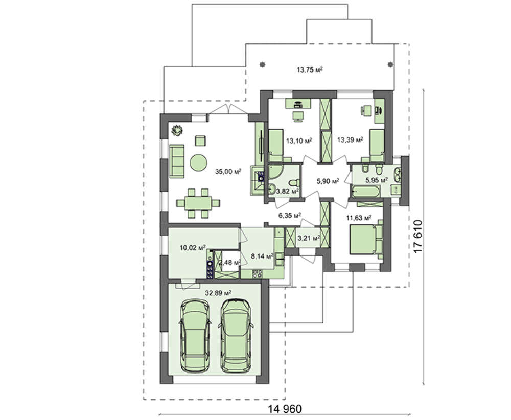 Проект содержит три раздела – АрхитектурныйКонструктивный и Инженерный: водоснабжение, отопление, вентиляция, канализация, электроснабжение (приобретается за дополнительную плату) + Пояснительная записка.