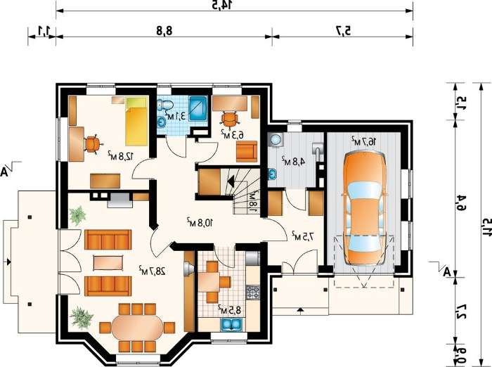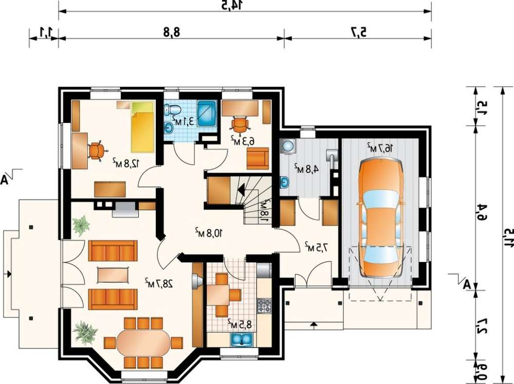 Гостиное помещение соединено со столовой. Свой выход на загородный участок очень удобен. Планируемые занятия легко переносятся на приусадебный простор, где отлично отдыхается, гуляется и прекрасно удаются деловые разговоры. Наиболее величавое место помещения отдано под прием пищи. Здесь уютно и полуприкрыто, красивые пейзажи за окнами создают приятную сказочную атмосферу. Удобно выполнен гараж. Находясь в пристроенном изолированном помещении, он не нарушает шумом ритм семейной жизни.