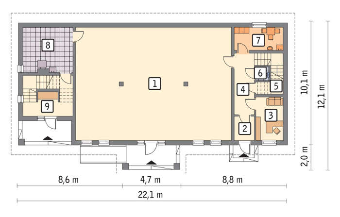 Проект содержит три раздела – АрхитектурныйКонструктивный и Инженерный: водоснабжение, отопление, вентиляция, канализация, электроснабжение (приобретается за дополнительную плату) + Пояснительная записка.