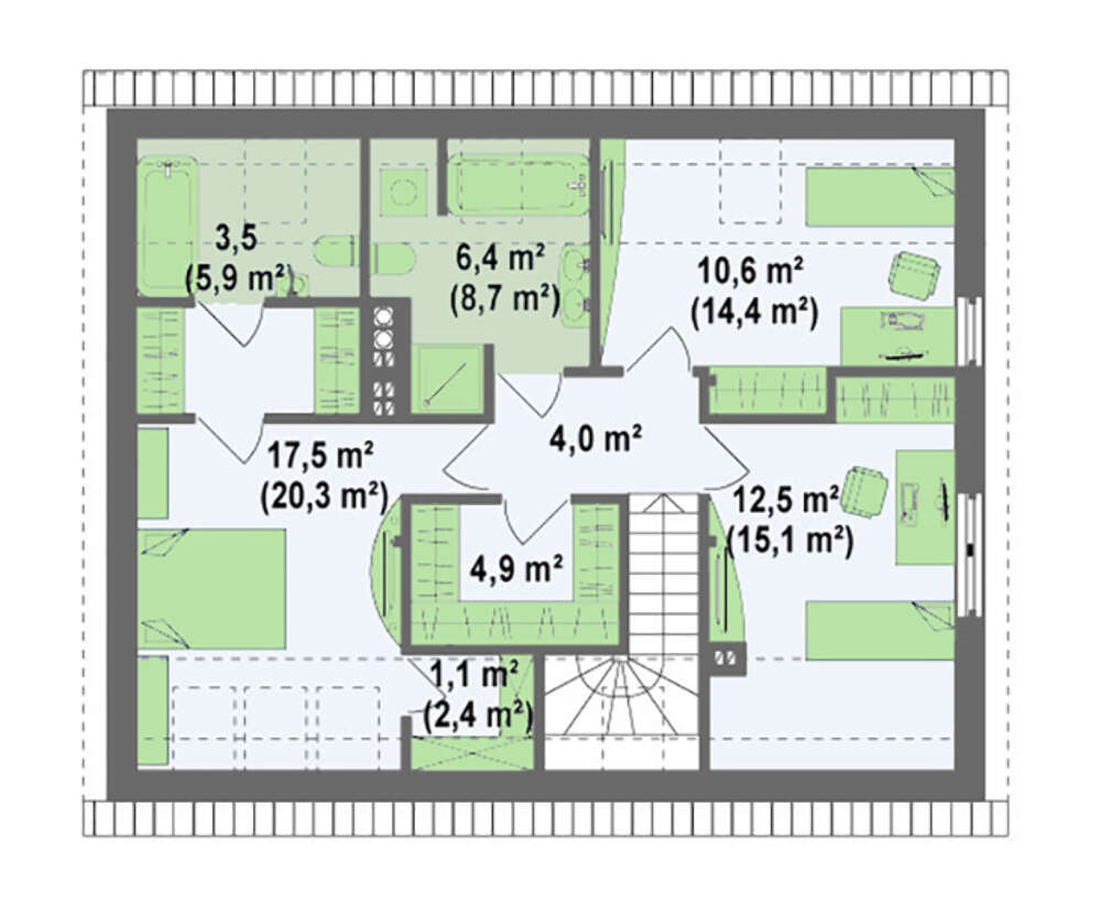 Мансарда отведена под ночную зону. Здесь расположены две детские спальни с нишами под встроенные шкафы и спальня родителей с ванной. К ней примыкает просторная гардеробная. При желании, ее можно убрать и устроить дополнительную зону отдыха. Но, надо полагать, что мама будет категорически против. И то, правда, а где же хранить все то, что "мне опять надеть нечего". Кроме того, дверь в гардеробную, скорее всего, будет перенесена из холла в спальню. Так, на всякий случай, чтобы дочка лишний раз не выясняла, доросла ли она до маминых нарядов.