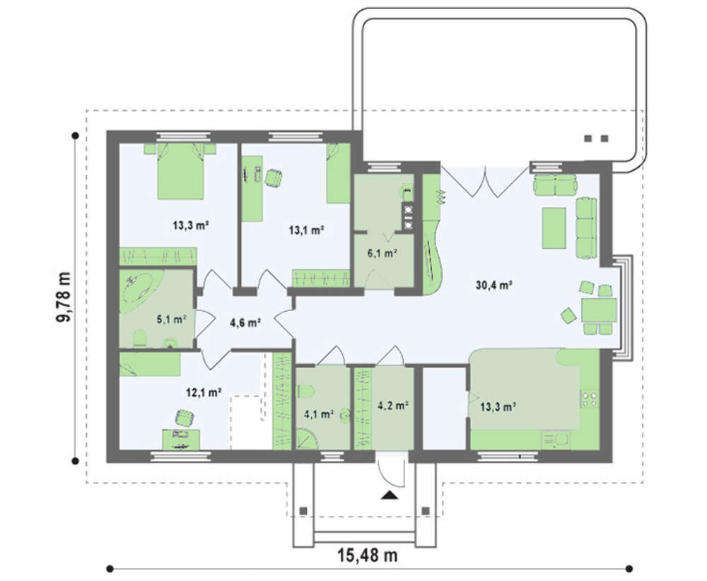 Проект небольшого одноэтажного коттеджа площадью 112 m²