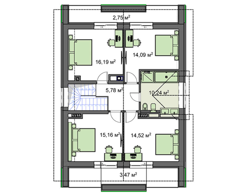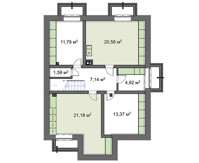 Для отдыха членов семьи запроектировано пять помещений. Комната первого этажа понравится старшему поколению семьи. Четыре спальни второго уровня имеют достаточные размеры, чтобы разместить мультимедийную технику и необходимую для отдыха мебель. Особенность личных апартаментов в больших балконах, выход на которые предусмотрен со всех спален. Их пространства достаточно для небольшого стола с креслами, шезлонгов или тренажера для спортивных упражнений.
