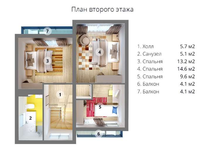 Внутреннее пространство с присущим европейцам рационализмом поэтажно разделено на две функциональные зоны: дневную и ночную. На нижней расположилась просторная гостиная. Это большое и светлое помещение, используемое жильцами для отдыха и приемов. В смежной комнате находится кухня-студия. Обычно ее используют для приготовления блюд, повседневных трапез и дружеских чаепитий. Остальная площадь уровня разделена между подсобными помещениями, включая котельную, которая обеспечивает обогрев дома при постоянном проживании. Верхний уровень — это территория сна. Здесь находятся личные комнаты членов семьи. Это три спальни, две из которых с собственными балконами. Для удобства на этаже имеется санузел.
