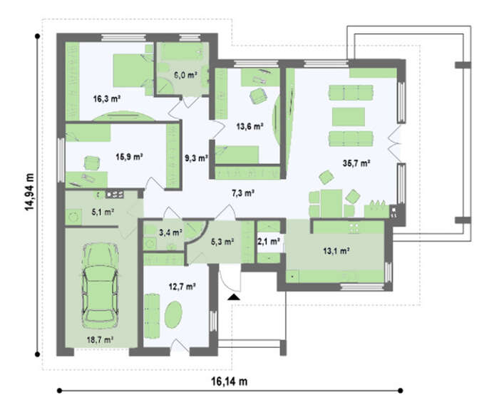 Проект уютного классического одноэтажного дома с гаражом для 1 машины