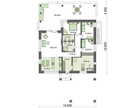 Красивый черно-белый коттедж обратит на себя внимание многих застройщиков, предпочитающих жизнь в одном уровне. Проект может быть использован как для дачного строительства сезонного жилья, так и постоянного проживания в условиях тесной городской застройки.