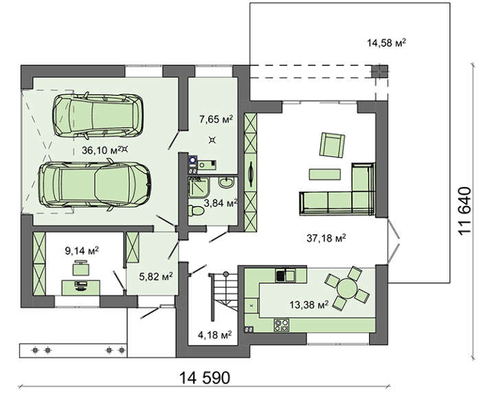 Для того чтобы хранить и обслуживать два автомобиля в планировке предусмотрен вместительный гараж, выделено место под мастерскую. Прием гостей ведется в просторной гостиной с собственным выходом на террасу.