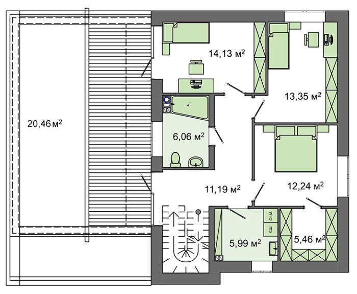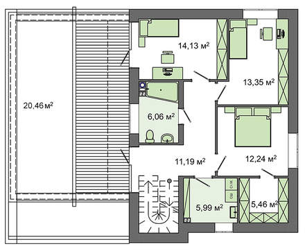 Второй этаж отдан под жилые помещения. Здесь имеется три спальни, различающиеся как размерами, так и планировкой. Наиболее благоустроенные апартаменты оборудованы личным гардеробом. Предусмотрено два выхода на огромную террасу: с одной из спален и общего помещения. К услугам жильцов санузел и гардероб.
