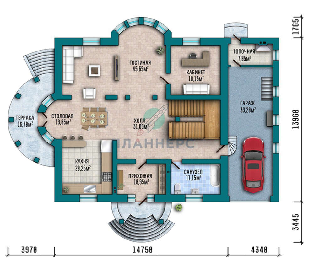Остальное пространство этажа разделено между прихожей, санузлом, котельной и гаражом почти в 40 квадратов для хранения и обслуживания автомобиля представительского класса. Из него можно попасть в подвальное помещение, которое имеет площадь почти 60 кв. м.