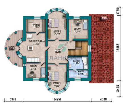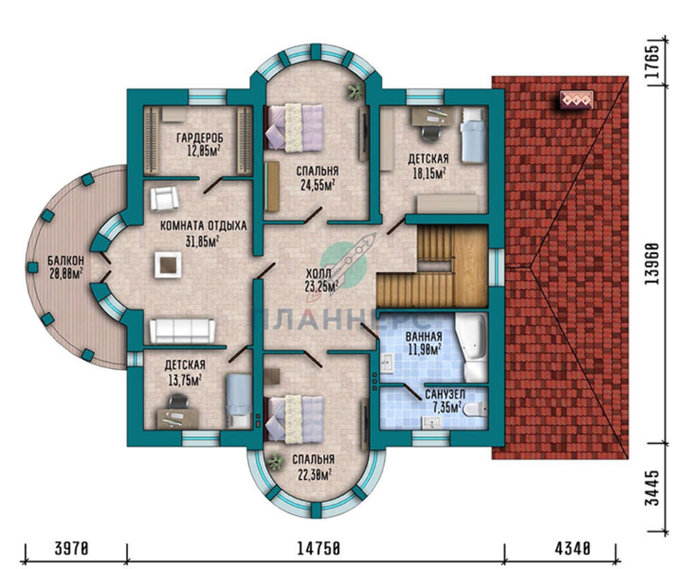 Верхний уровень представляет собой личную территорию жильцов. Центральное место занимает большая комната с эркером в 32 кв. м, располагающая к семейному отдыху. Она имеет выход на не менее просторный балкон. Кроме того, на этаже находятся две спальни для взрослых, две детских комнаты.