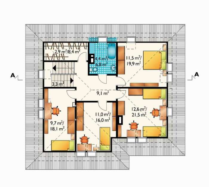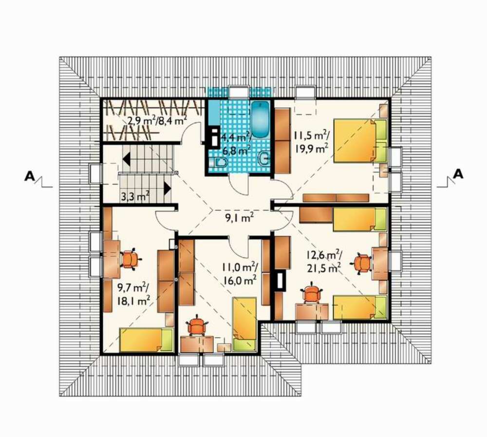 Все приватные комнаты отнесены на второй этаж. Такое расположение поможет поддерживать тишину в личное зоне, обеспечивает полноценное расслабление и отдых.