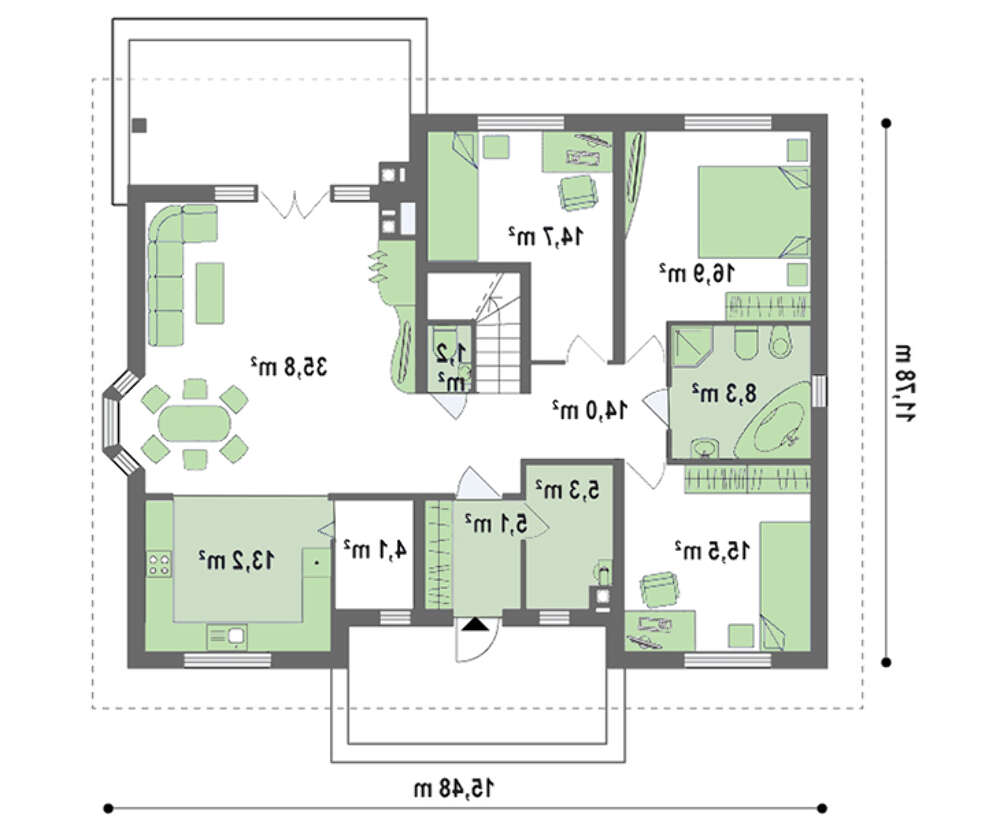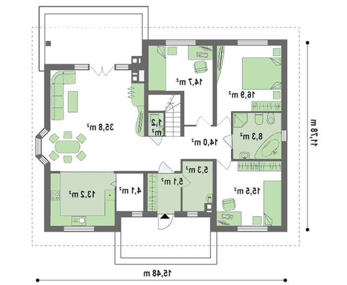 В доме 4М011С все функциональные комнаты находятся на первом этаже. Хоть у него и есть мансарда, но она не высокая и не содержит жилых комнат. На первом этаже достаточно комнат для полноценной жизни семьи. Это и гостиная со столовой и кухней, и три спальни с ванной комнатой. Лестница все же есть, но она не такая востребованная как в двухэтажных домах. Она скорее сделана на перспективу. Если семья станет больше, и домочадцам будет тесно на одном этаже, второй - можно переоборудовать под жилые комнаты. Ведь он изначально сделан хорошо утепленным и с мансардными окнами. Ну а пока, его можно использовать в хозяйственных целях, к примеру, как сушилку для белья. Можно использовать его и для отдыха: поставить бильярдный стол или стол для пинг-понга. В общем, пока это только ухоженное чердачное помещение с окошками и «плацдарм» для фантазии хозяев.