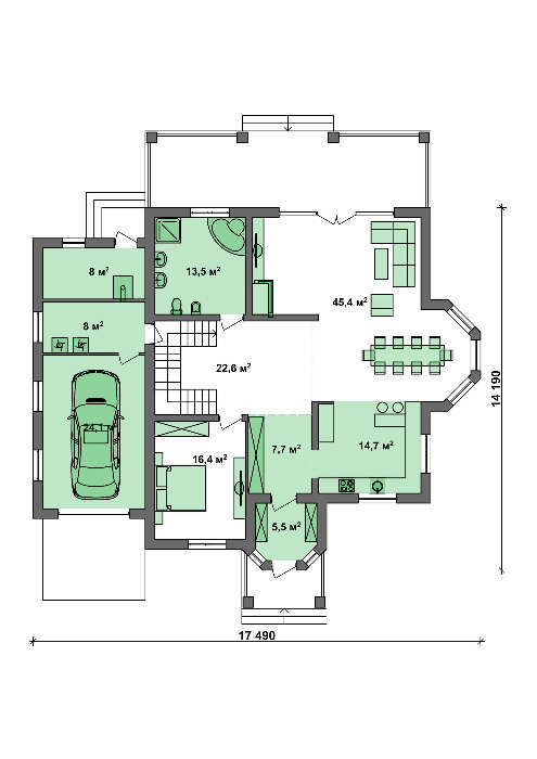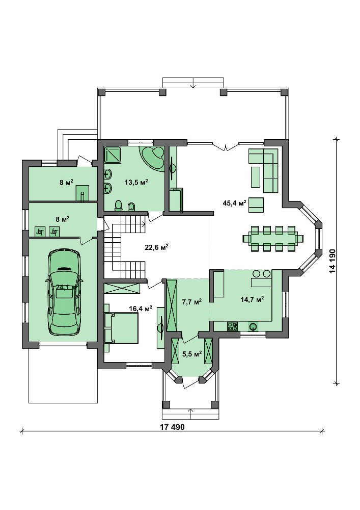Проект содержит три раздела – Архитектурный, Конструктивный и Инженерный: водоснабжение, отопление, вентиляция, канализация, электроснабжение (приобретается за дополнительную плату) + Пояснительная записка.