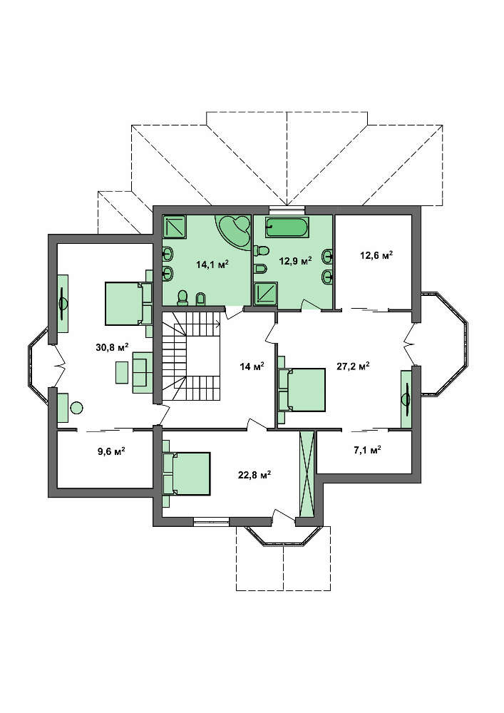 Отличительная черта строения — большие по размерам и дающие множество комфорта спальни, которых в масштабах коттеджа предусмотрено четыре. Для наиболее простого выделено место на первом этаже, если таково требование обладателя, его можно применять для кабинета. Расположенные на втором уровне способны порадовать даже самого требовательного жильца и отличаются разнообразием габаритов и удобств. В своем распоряжении — это одна, две или три комнаты. Все оборудованы интересными балконами. Одно из спальных помещений имеет даже свой личный просторный санузел.