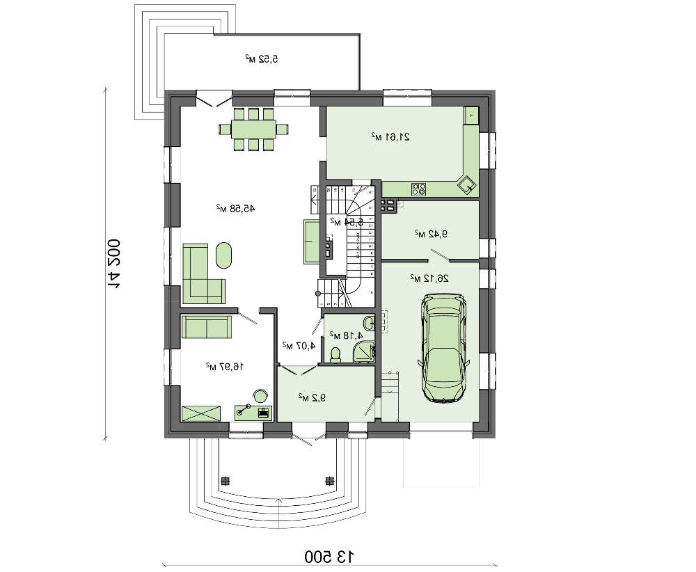 Первый этаж – это простор и свобода. За счет объединения в одно пространство столовой и гостиной получена шикарная студия, площадь которой достигает 45 квадратов. Собственный выход на террасу размерами в 5 кв. вносит разнообразие в отдых и дружеские встречи. Кухня занимает более 20 кв., места предостаточно, чтобы готовить пищу на самые шикарные застолья. Размеры гаража позволяют разместить в нем автомобиль представительского класса. Около 10 кв. выделено на мастерскую, где будут выполняться ремонтные работы и храниться запчасти с инструментом.