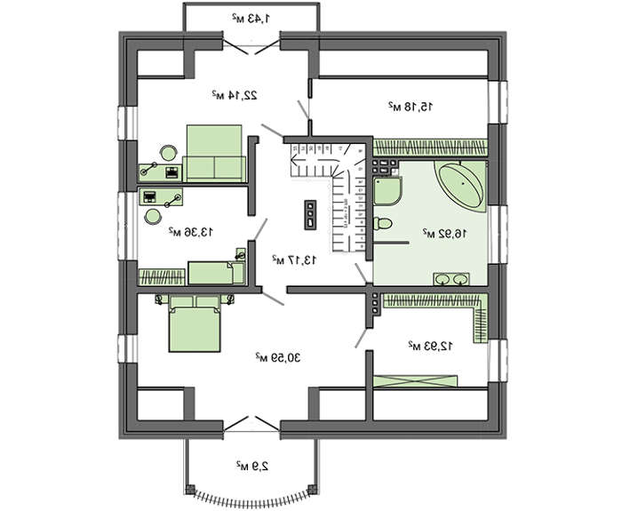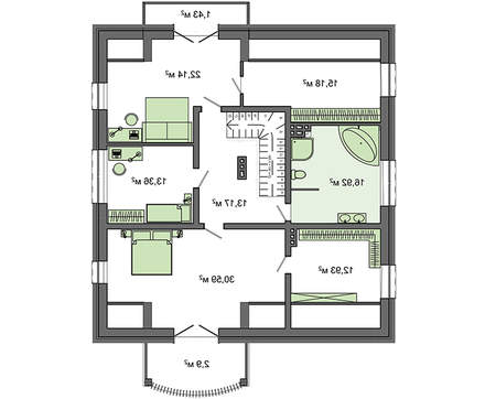 Спален 4, одна из них на первом этаже. Комнаты второго уровня непохожи одна на другую. Есть небольшая спальня. Два помещения выполнены в виде шикарных апартаментов на 2 комнаты, вторую из которых можно использовать как гардероб или дополнительное жилое помещение. Романтическое настроение поддерживают собственные балконы. Роскошная санитарная комната позволит превратить водные процедуры в настоящий ритуал.