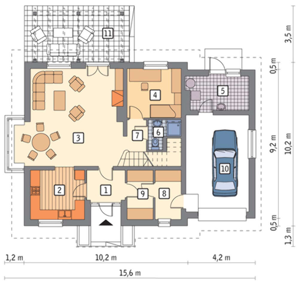Встроенный гараж позволит хранить с удобствами один автомобиль. Примыкающая площадь топочной может быть оборудована под мастерскую. Среди нежилых помещений стоит отметить просторную гардеробную.