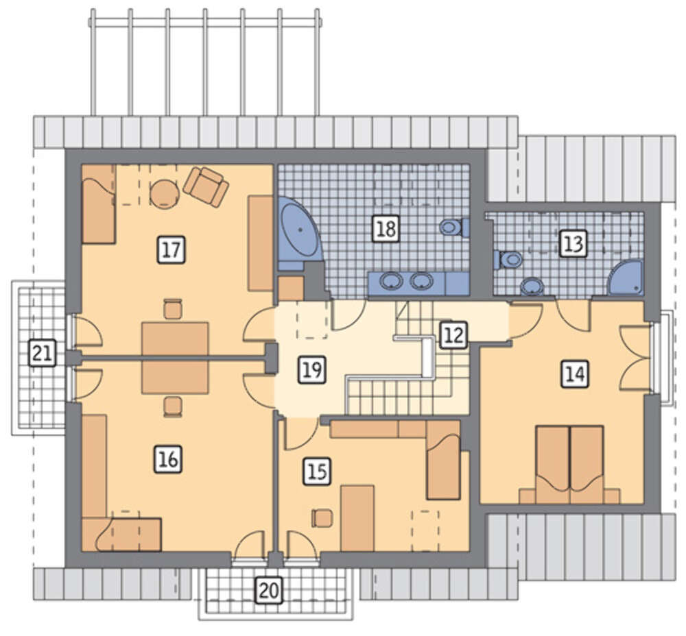 Внутренне пространство оформлено необыкновенно функционально, предусмотрена масса помещений вспомогательного назначения для создания комфорта и уюта. Самую большую комнату первого этажа занимает гостиная, совмещенная со столовой. Под место для проведения застолий определена площадь эркера, что позволило создать роскошную атмосферу на время обедов и ужинов. Из помещения предусмотрен выход на шикарную террасу, площади которой достаточно для того, чтобы устроить зону отдыха или провести вечеринку с барбекю.