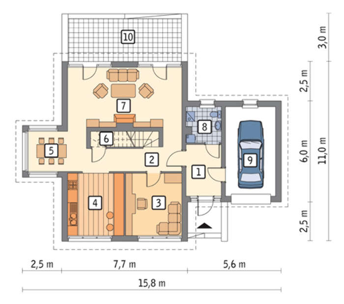 Столовая перенесена в зону эркера – это наиболее красивое место, способствует созданию отличного настроения на время обеда. Отдельная комната первого уровня хорошо подходит для кабинета или спальни старшего поколения. Гаражная территория помимо места для хранения авто имеет достаточно площади, чтобы хранить инструмент и выполнять ремонтные работы.