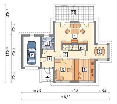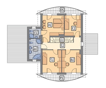 Столовая перенесена в зону эркера – это наиболее красивое место, способствует созданию отличного настроения на время обеда. Отдельная комната первого уровня хорошо подходит для кабинета или спальни старшего поколения. Гаражная территория помимо места для хранения авто имеет достаточно площади, чтобы хранить инструмент и выполнять ремонтные работы.