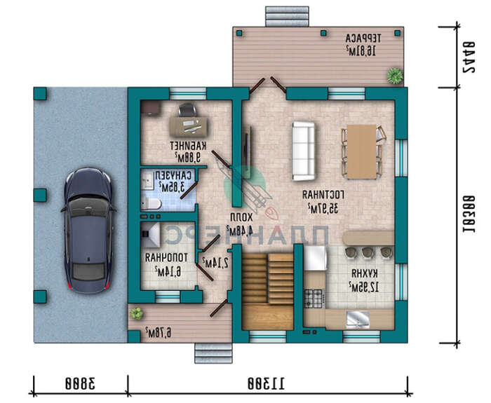 Планировка делит нижний этаж на гостиную и рабочую зону. Большую часть в почти 50 квадратов занимает зал, выполняющий функции места отдыха и приготовления пищи. Отсутствие перегородок наполняет помещение свободой и простором. Здесь хозяева могут не только обедать, но и принимать гостей и устраивать семейные торжества.