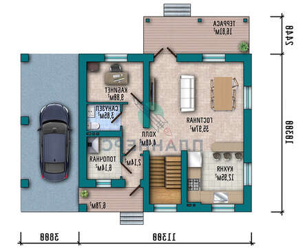 Украшением коттеджа служит шикарный входной портал в виде бетонного крыльца с квадратной колонной. Для его ограждения использована ажурная металлическая конструкция, дизайном перекликающаяся с балконом второго этажа. Для отдыха в летнее время можно использовать просторную красивую террасу площадью в 16 кв. м, выход на которую предусмотрен из гостиной.