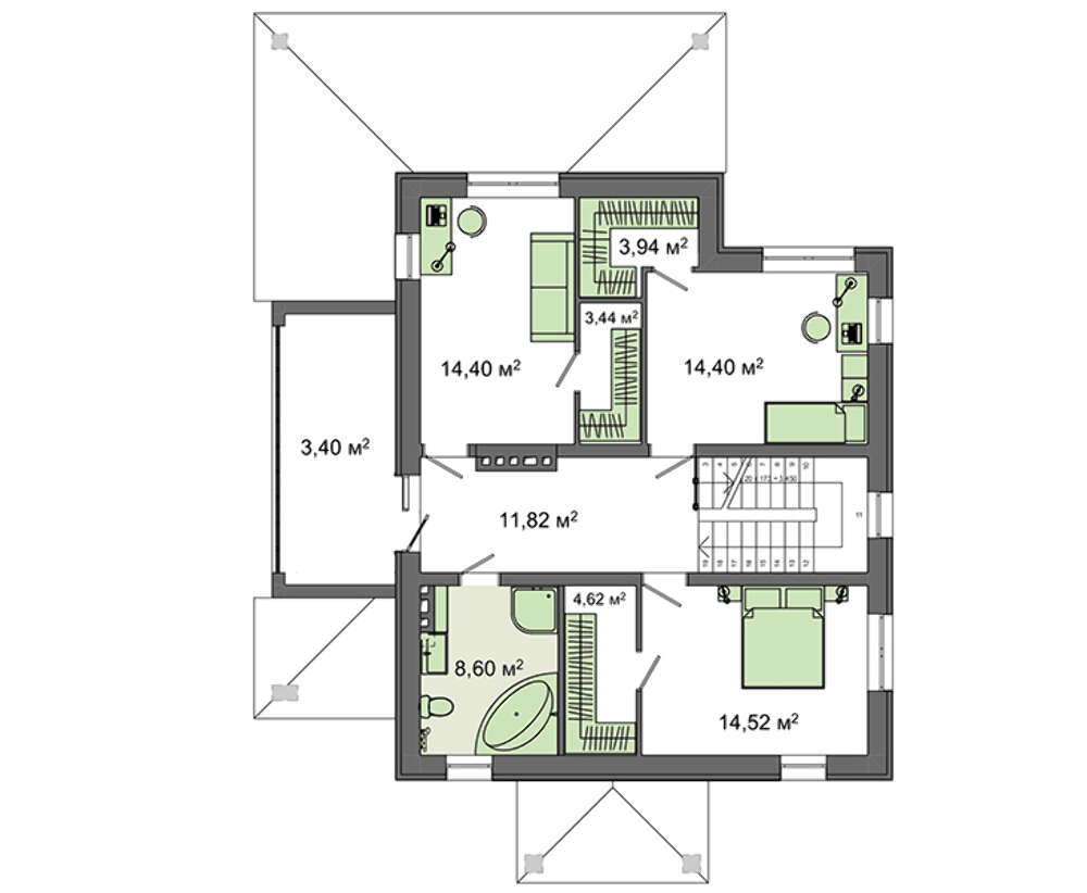 На втором этаже разместились личные апартаменты жильцов. Все спальни оборудованы собственными гардеробами. На уровне находится просторный санузел с массажной ванной для общего пользования и балкон.