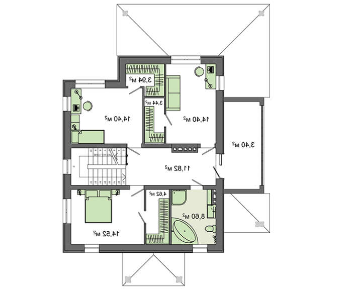На втором этаже разместились личные апартаменты жильцов. Все спальни оборудованы собственными гардеробами. На уровне находится просторный санузел с массажной ванной для общего пользования и балкон.