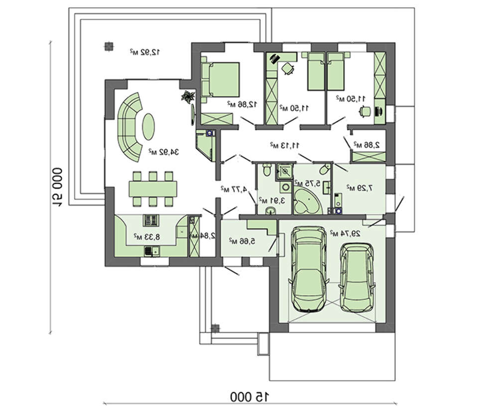 В плане имеется три спальни, что достаточно для проживания среднестатистической семьи. Комнаты небольшие, но их площади довольно для комфортного проживания. Мобильная семья высоко оценит просторный гараж. Его площадь в 30 кв. м поможет с удобствами хранить два автомобиля. Прилегающее помещение топочной пригодится для хранения запасных частей и инструмента. Удобные условия для проживания поддерживаются наличием гардероба и двух санпомещений, небольшой прихожей со шкафами для верхней одежды.