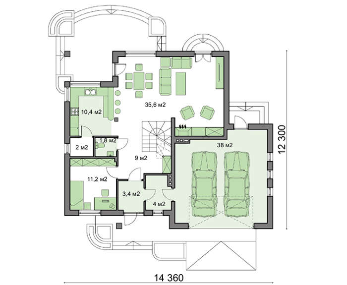 Во внутренней планировке присутствует рационализм. Здесь нет просторных холлов и длинных коридоров, каждый сантиметр площади несет свою функциональную нагрузку. Пространство дома можно разделить на территорию дня и ночи. На первом этаже находится зона бодрствования, включающая просторный зал, объединенный со столовой, большую кухню с прилегающей кладовой и личный кабинет владельца дома. Его легко можно перепрофилировать под комнату для гостей или спальню пожилых членов семьи.