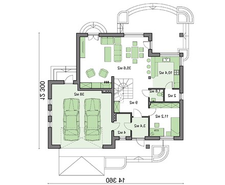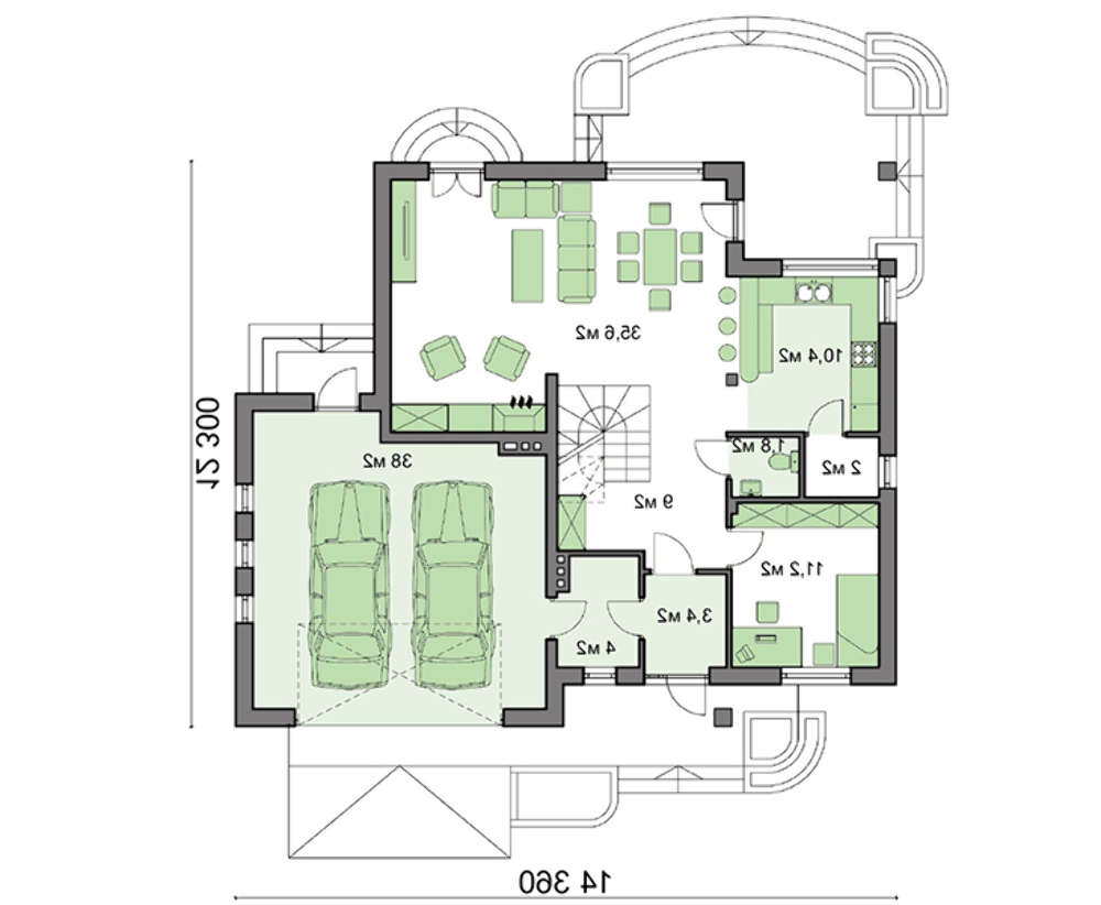 Во внутренней планировке присутствует рационализм. Здесь нет просторных холлов и длинных коридоров, каждый сантиметр площади несет свою функциональную нагрузку. Пространство дома можно разделить на территорию дня и ночи. На первом этаже находится зона бодрствования, включающая просторный зал, объединенный со столовой, большую кухню с прилегающей кладовой и личный кабинет владельца дома. Его легко можно перепрофилировать под комнату для гостей или спальню пожилых членов семьи.