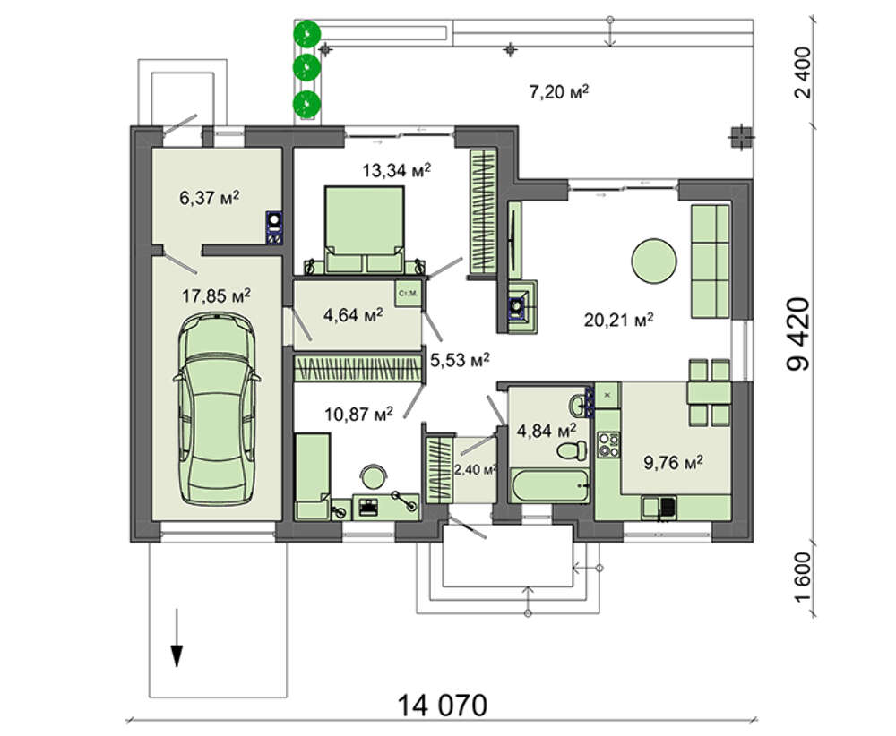 Стильный одноэтажный коттедж площадью 103 кв. м является идеальным представителем немецких традиций в европейской архитектуре. Главная особенность дома в рационализме и практичности, эти принципы соблюдаются как при оформлении экстерьера, так и во внутренней планировке. Коттедж рассчитан на комфортное проживание молодой семьи из трех человек. Проект может быть использован как для сезонного, так и круглогодичного проживания.