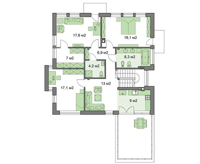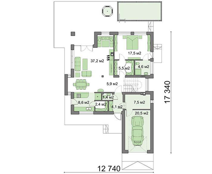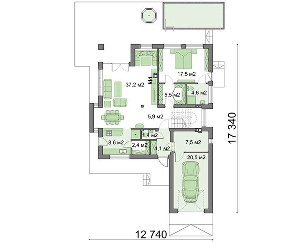Гостиная соединила вместе столовую, кухню и место отдыха. Полученное помещение отличается значительными размерами. Центральная часть отдана под камин, который согреет и создаст особую душевную атмосферу в холодное время года. Кухня отодвинута в самую дальнюю часть помещения, чтобы оградить жилую зону от пищевых запахов.