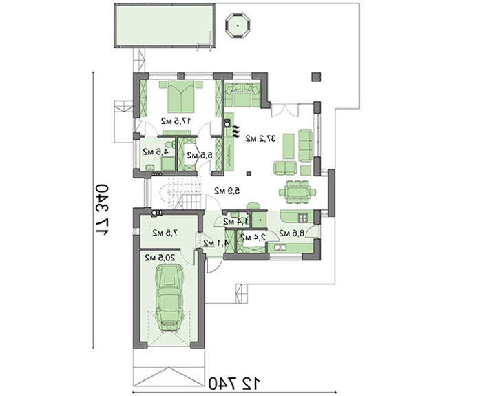 Гостиная соединила вместе столовую, кухню и место отдыха. Полученное помещение отличается значительными размерами. Центральная часть отдана под камин, который согреет и создаст особую душевную атмосферу в холодное время года. Кухня отодвинута в самую дальнюю часть помещения, чтобы оградить жилую зону от пищевых запахов.