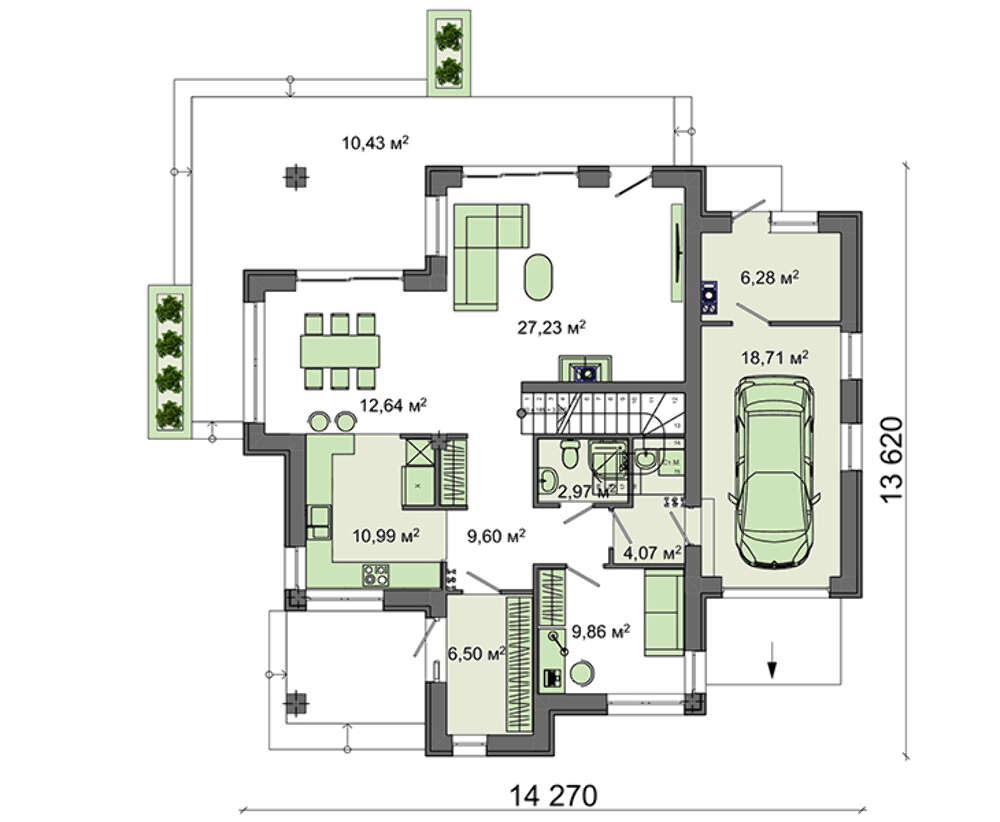 Общая часть первого этажа выполнена без разделяющих перегородок. Такая планировка позволяет наполнить уровень солнечным светом и способствует хорошему воздухообмену. Имеется площадь для хранения автомобиля и выполнения сервиса.
