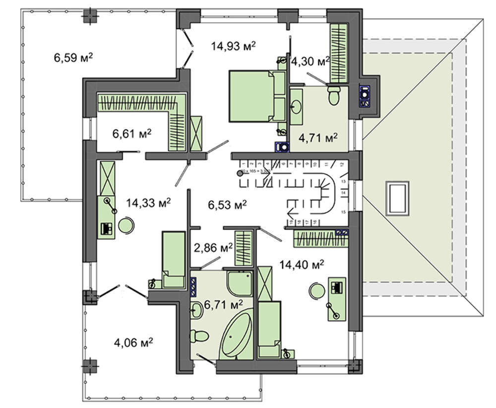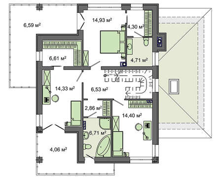 Особенность внутренней планировки в личных комнатах. Для повышения уровня комфорта в их состав включены гардеробные и санитарные помещения. предусмотрены просторные веранды. Балконные площади которых можно рассматривать как продолжение жилых комнат, использовать для приема гостей и организации романтических вечеринок.