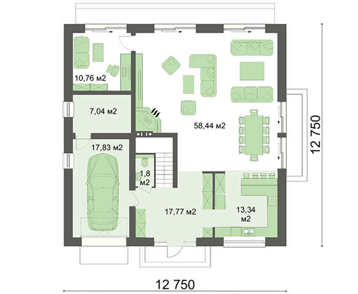 Кухня отнесена в угловую часть комнаты. Отдаленность служит хорошей защитой жилой зоны от пищевых ароматов. Площади достаточно, чтобы семейные обеды проводить на ее территории. Отдельная спальня будет приятным подарком для старшего поколения, предпочитающего время проводить на первом уровне.